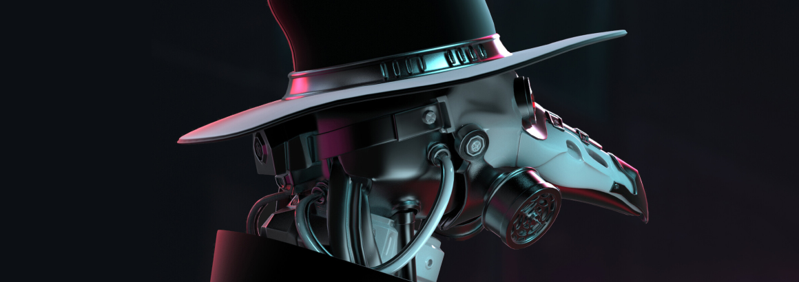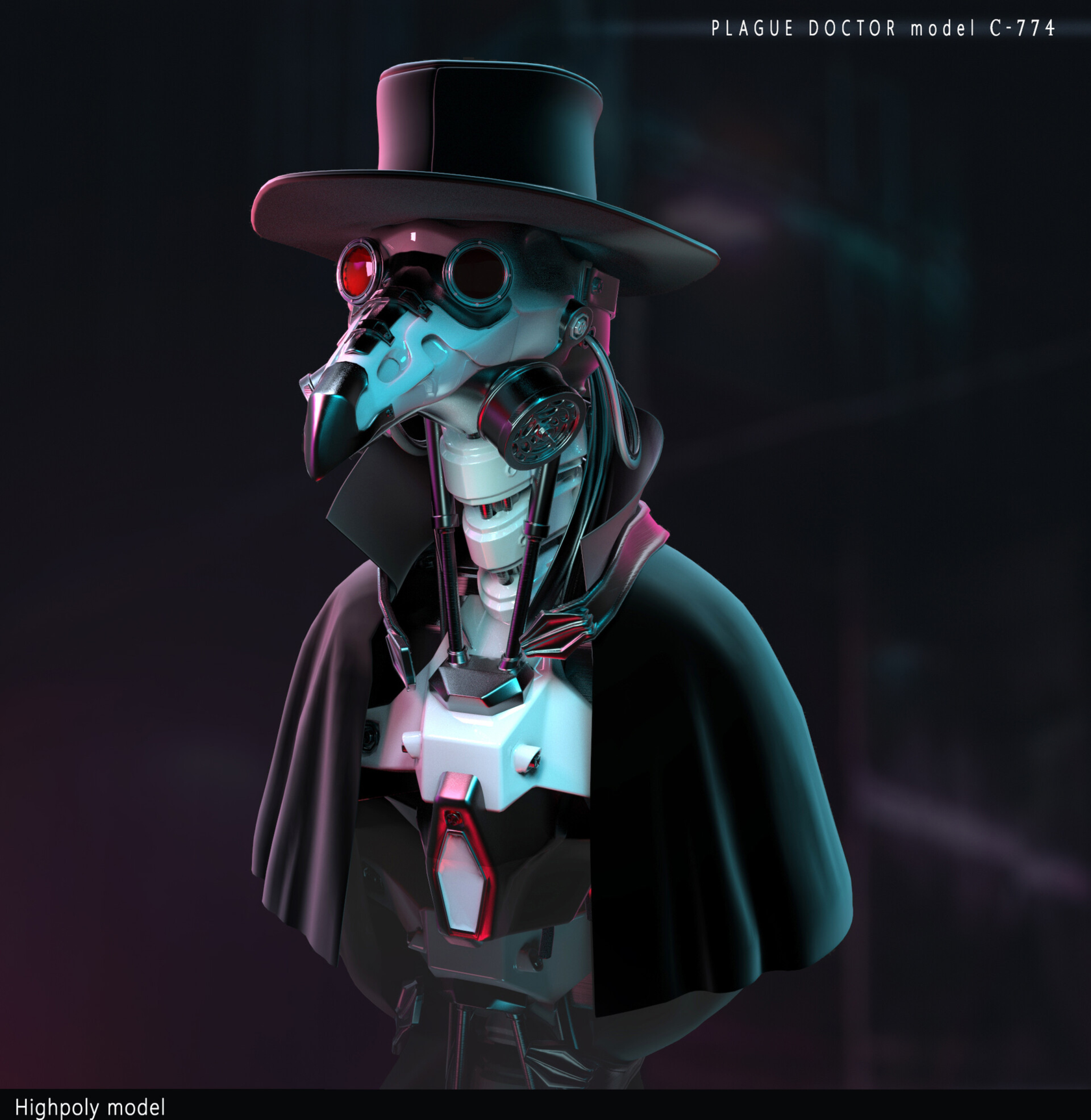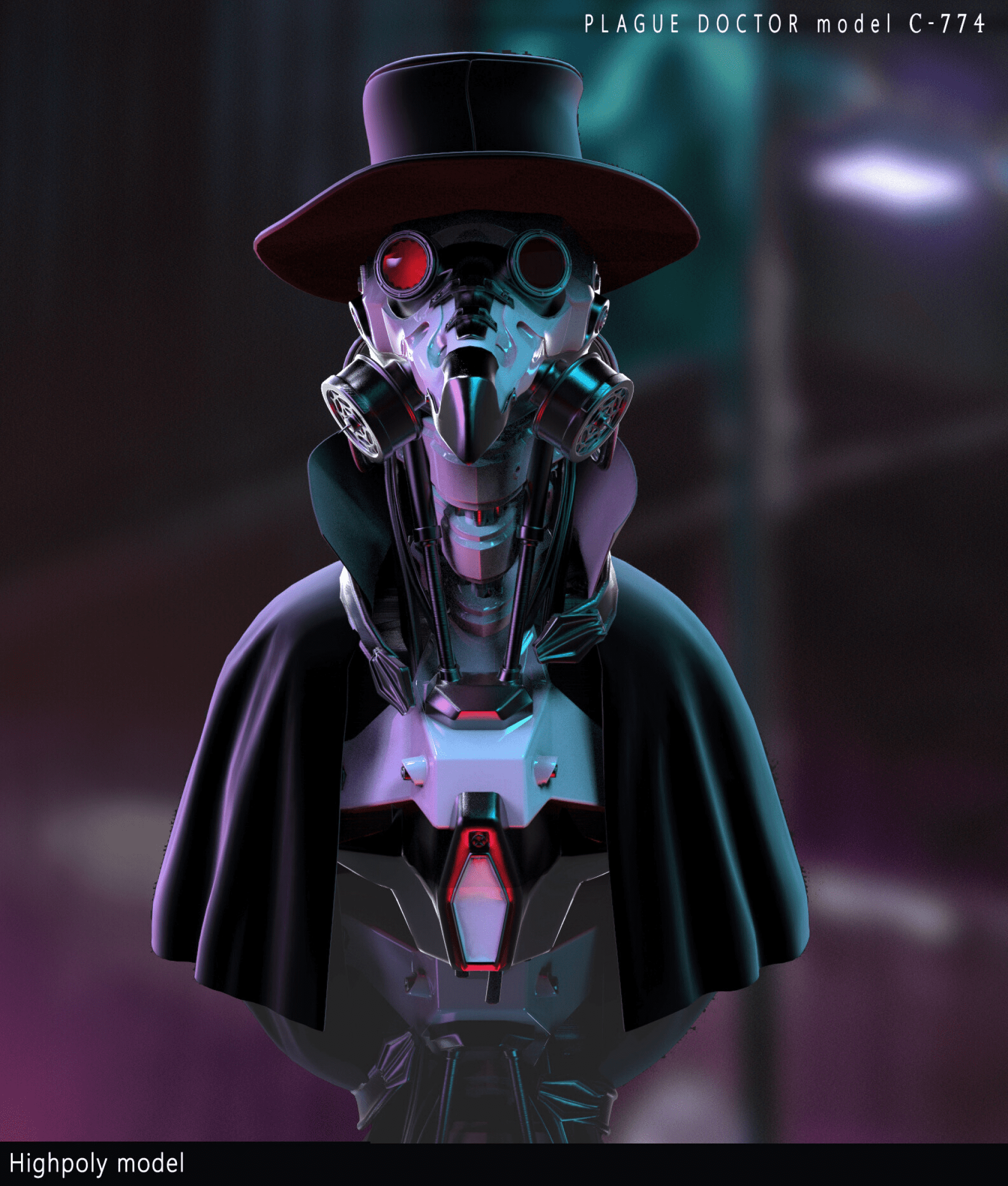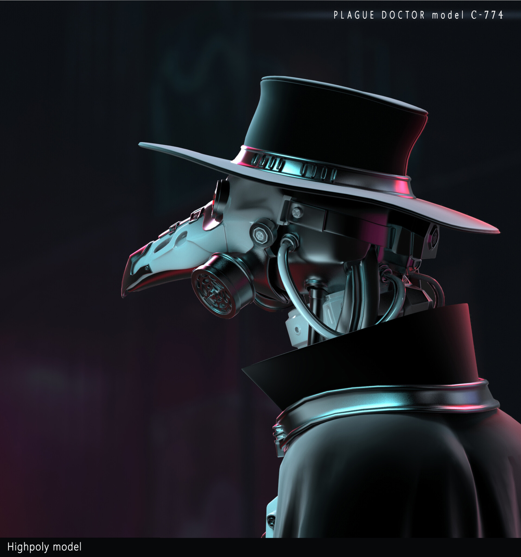 Оружие и технику для hard surface Катерине делать не хотелось, шлемов тоже было много сделано до нее. Так что она подумала, почему бы не совместить чумного доктора и киберпанк, тем более, что такого ещё не было. Собрала рефы, нарисовала в блокноте примерный концепт и понеслось.